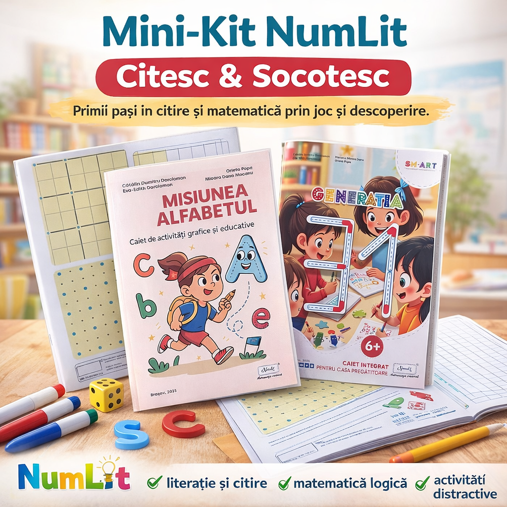 Mini-Kit NumLit – Citesc & Socotesc este un pachet educațional compact, conceput pentru a sprijini copilul în dezvoltarea citirii, scrierii și gândirii matematice.